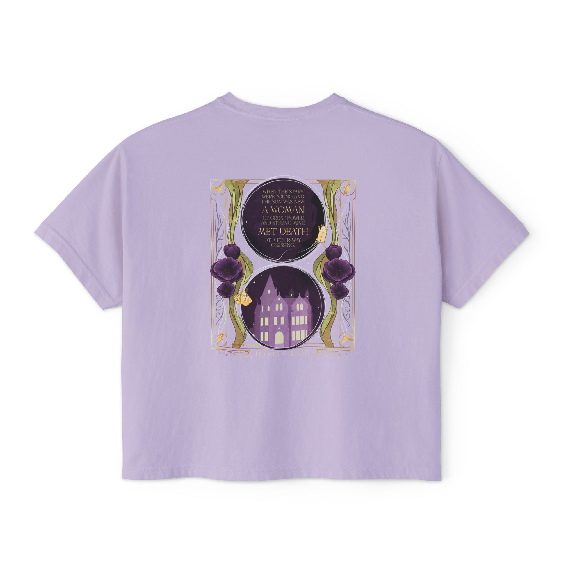 A relaxed boxy tee with a vintage, pigment-dyed finish that feels lived-in from the first wear. The heavy, ring-spun cotton holds bold DTG/DTF prints with crisp detail while the shoulder-to-shoulder twill keeps the shape steady. Slightly cropped and cut for a roomy silhouette, this tee carries a subtle old-world design in rich purples and golds—it reads like a wearable poster from a strange, elegant story. It slips into quiet evenings, layered under an oversized cardigan or worn solo with high-waist jeans. The fabric’s weight and pigment-dyed variations give each shirt a unique, slightly faded character that ages with you rather than against you.