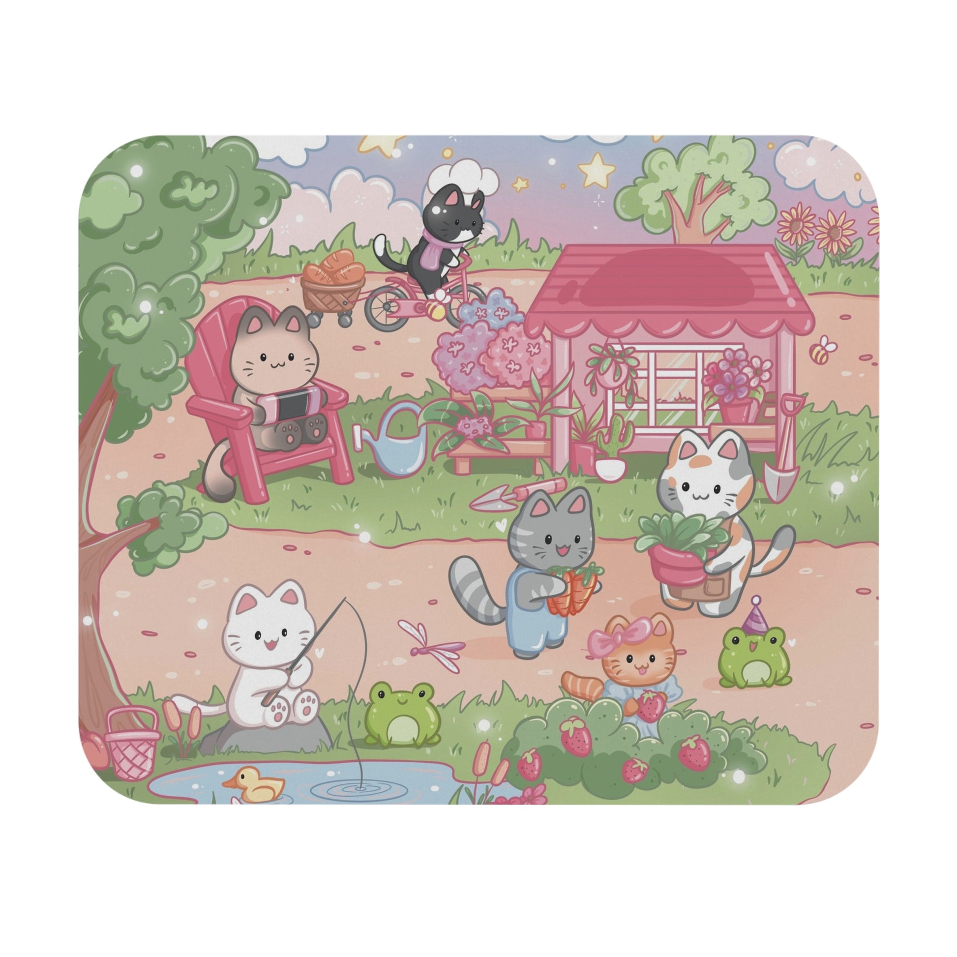 Created to enhance anyone’s online browsing and gaming experience, these personalized mousepads come with our hand illustrated Cozy Gamer Cats scene, and feature adorable kittens going about their daily gamer duties - gardening, fishing, cooking and more. Thanks to the rubber base, your mouse pad has a firm grip on the desk, while your design goes on the stain-resistant cloth top side. With a 1/16th” thickness, you’ll find this mouse pad delivers smooth mouse sliding action for both working and playing. A perfect addition to any cozy gaming desk setup or for gifting to a friend!