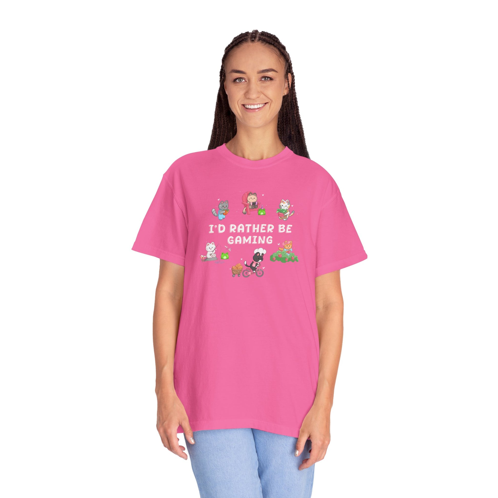 Show off your love for cozy gaming with our adorable gamer cats "I'd rather be gaming" tee. We have cats doing all the cozy gaming tasks like cooking, farming, fishing, and more!