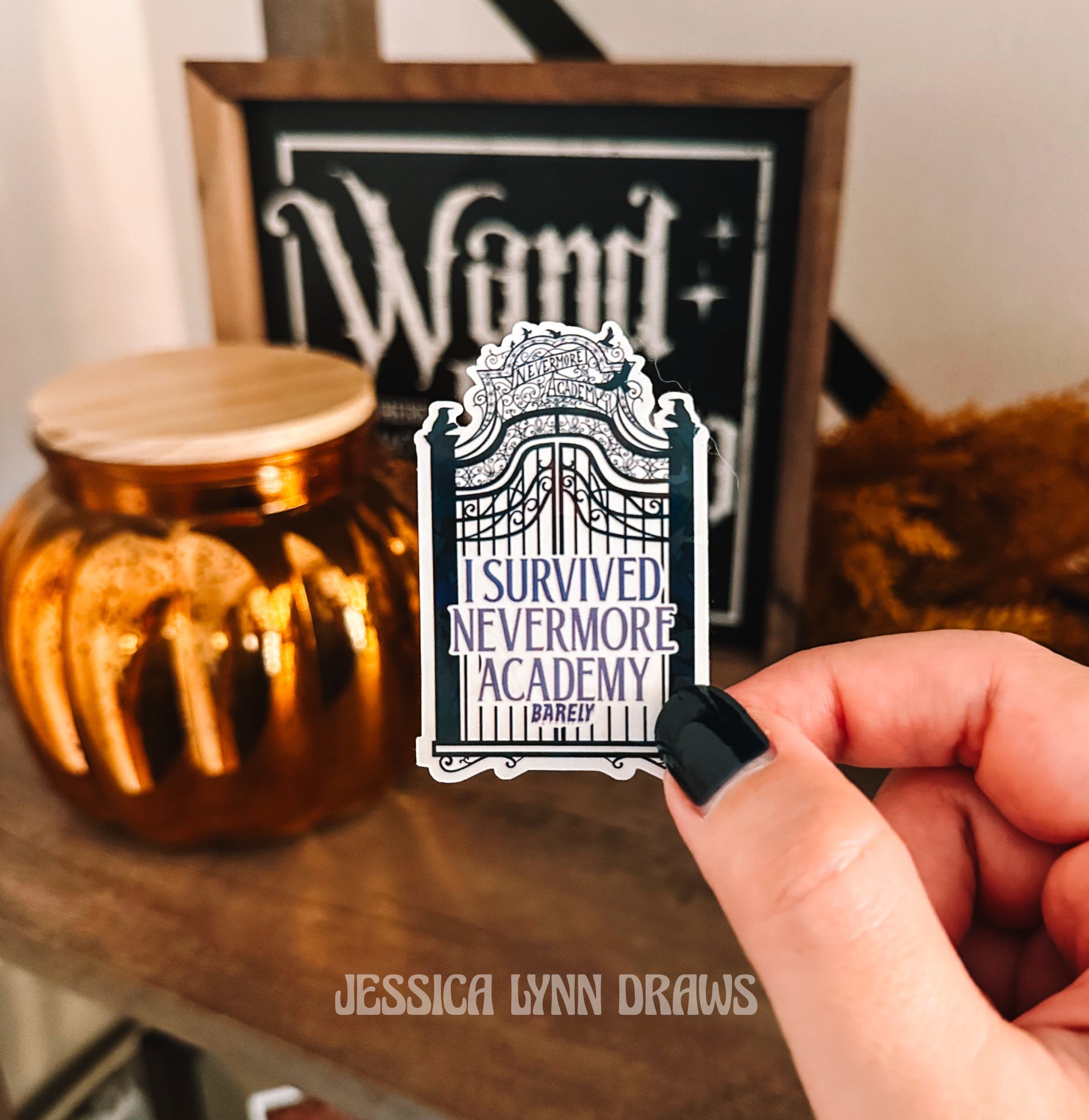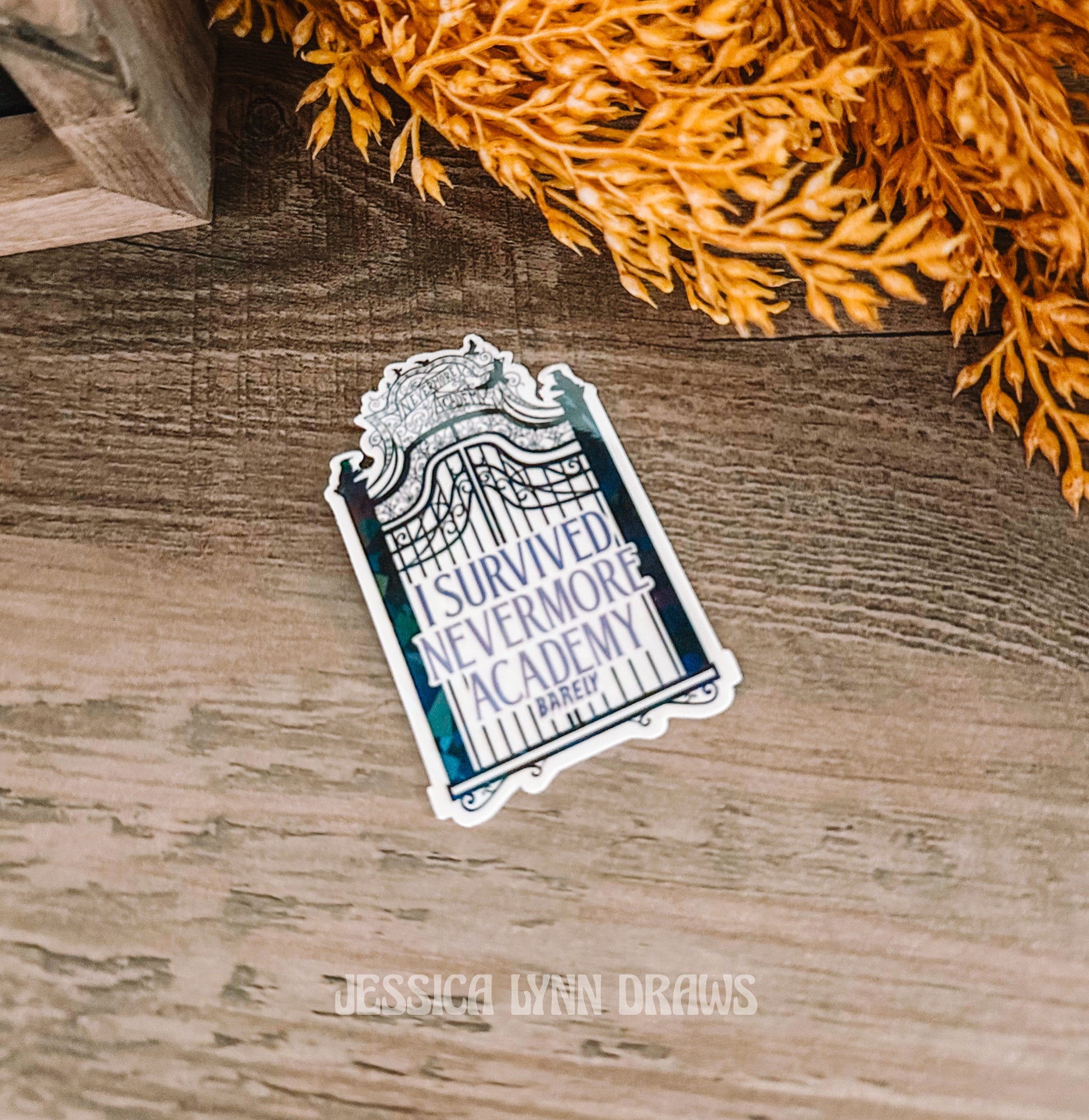 A fandom “I Survived the Acadmy” spooky goth, dark academia vibes sticker with holographic vinyl overlay!